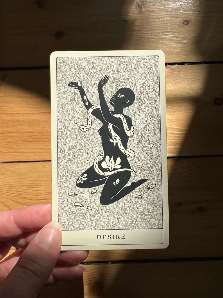 Photos depict episode title card featuring the episode title, logo of the show with beautiful photo of guest Laura Carbone sitting slightly at a lean against a draped neutral curtain. The other photos is the same photo of Laura, just without the titles and overlay on top, and then a photo of the card Desire that Laura pulled from the Poesis Oracle deck. She describes the card in detail on the episode.